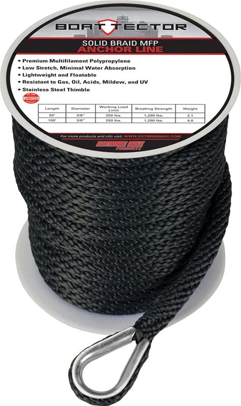 Extreme Max 3006.2048 Boattector Solid Braid MFP Anchor Line With Thimble - 3/8" X 50', Black