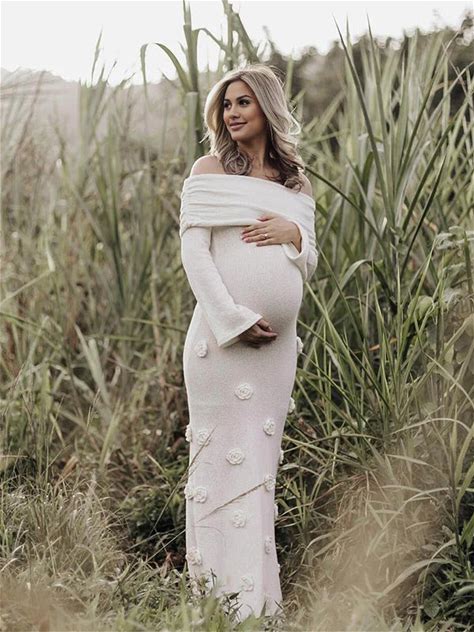 Momyknows White Off Shoulder 3D Flowers Backless Bodycon Mermaid Cocktail Party Gowns Bandage Photoshoot Maternity Maxi Dress White / M