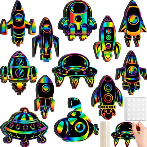 Engrowtic 72 Pieces Rocket Scratch Cards Outer Space Theme Party Scratch Crafts Rainbow Rocket Paper Card Art Favors For DIY Crafts Home Decoration