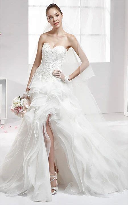 High-Low Strapless Ruffled Appliqued Satin Wedding Dress With Sweep Train - White, Size 8 By Dorris Wedding